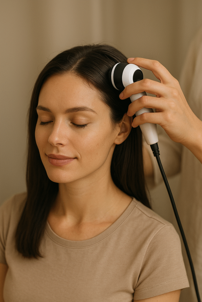 Pracuję w nurcie trychologii holistycznej, więc pierwsza wizyta to konsultacja, wywiad i badanie trichoskopem, na którym oceniam stan Twojej skóry głowy, ale także parametry dotyczące włosów i mieszków włosowych.